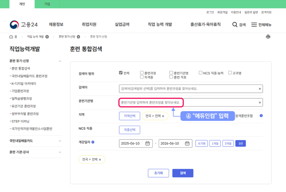 ※ 고용24에서 기관명에 "에듀인컴"을 검색하시면 쉽게 찾으실 수 있습니다.