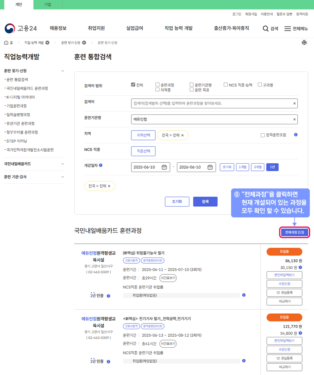 ⑥ 전체과정 버튼을 클릭하면 현재 개설되어 있는 과정을 모두 확인할 수 있습니다.
