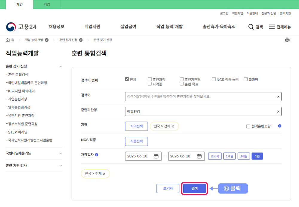 ④ 훈련기관명에 "에듀인컴" 입력