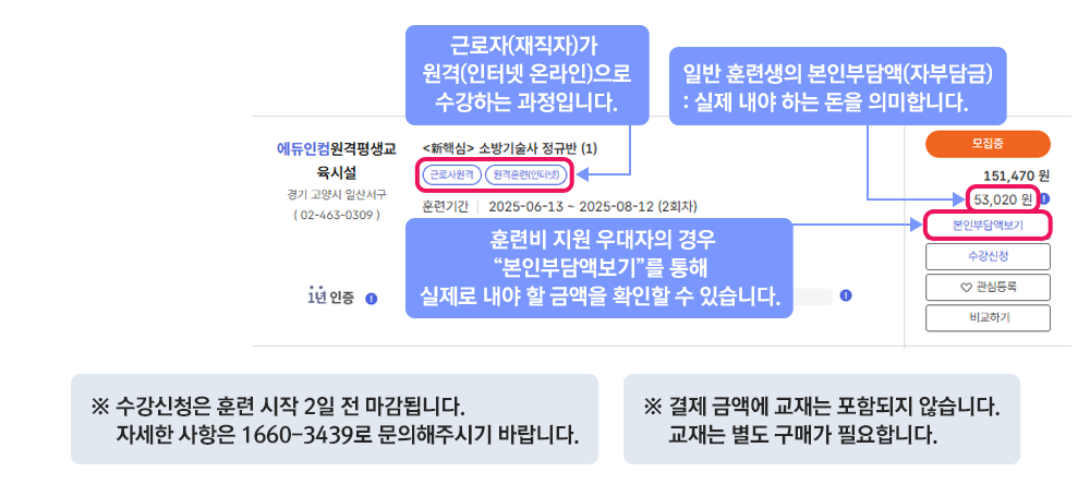 - 과정에 붙어있는 파란색의 근로자원격, 원격훈련(인터넷) 표시는 근로자(재직자)가 원격(인터넷 온라인)으로 수강하는 과정이라는 뜻입니다.