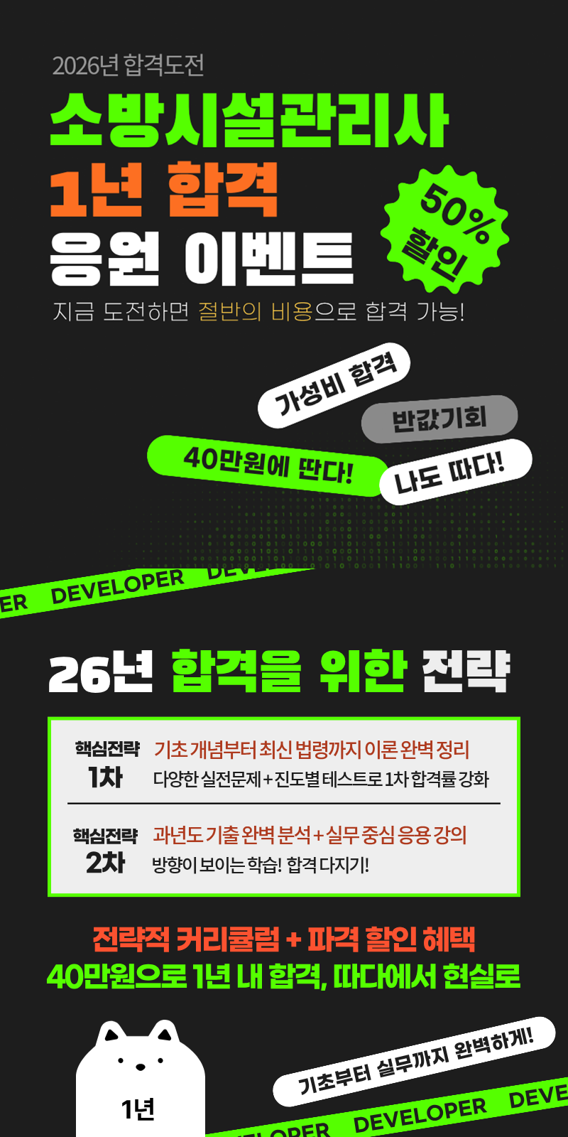 소방안전관리론(기초이론 중심) / 소방기계 점검실무 / 소방전기 점검실무 / 소방관계 법령(건축법, 초고층·지하연계특별법 등 포함).